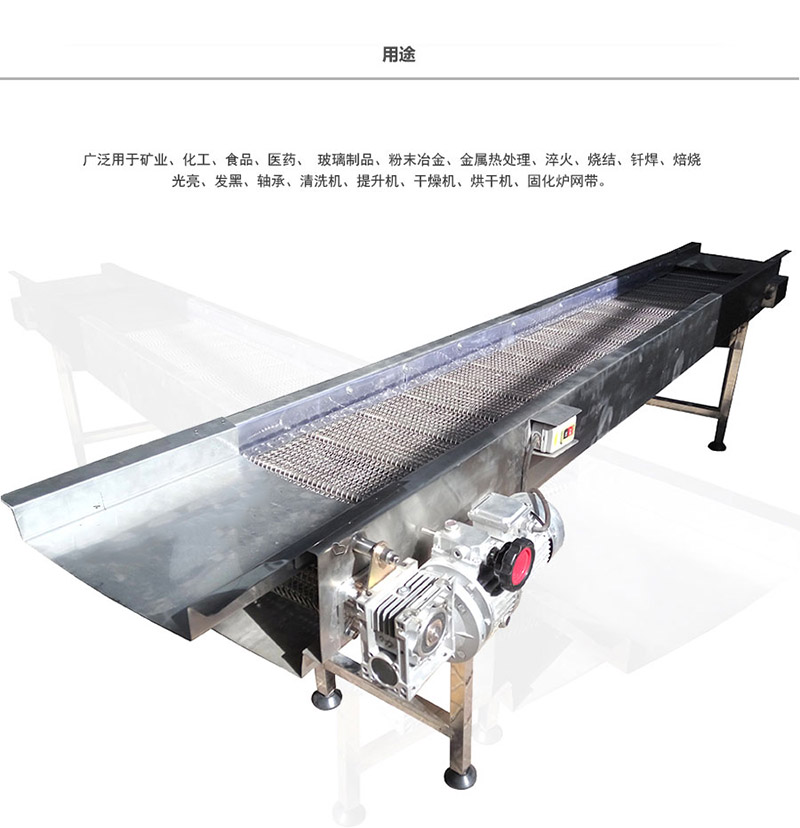 广泛用于玻璃制品行业的退火炉网带、烤花炉网带等。食品加工行业、脱水蔬菜、速冻食品单冻机前处理网带、链网。粉末冶金、金属热处理、淬火、烧结、钎焊、焙烧、光亮、发黑、轴承、渗碳高温炉网带、挡板式网带、涂装烘干线输送网带、泡沫镍还原生产线网带,清洗机、提升机、干燥机、烘干机、固化炉网带。