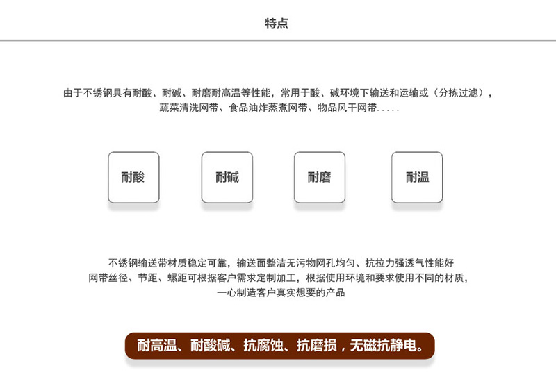 材质有不锈钢304、不锈钢316、不锈钢 1Cr18Ni9Ti特等材质不锈钢丝制作。
